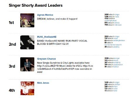 agnes monica kembali mendapatkan kesempatan untuk meraih piala dalam ajang shorty awards. ia kini duduk di puncak polling penyanyi terpopuler di twitter.akun twitter @agnezmo ikut bersaing dengan para musisi lainnya di dunia dalam ajang shorty awards 2013. ia mendapat dukungan paling banyak yaitu sebanyak 3.498 suara.di posisi kedua ada ruki personel band jepang the gazette. lalu disusul bintang youtube greyson chance dengan total voter sebanyak 2.086 suara. nick jonas dan carly rose sonenciar berada di urutan lima besar.meski di kategori penyanyi agnes berada di puncak, tidak demikian dalam kategori musik. agnes harus puas dengan meraih tempat kelima. total suara yang didapatnya 1.236 suara. demi lovato menjadi nomor pertama di kategori musik. lalu disusul sahabatnya, miley cyrus. namun angka voter belum final. karena pemungutan suara masih dibuka hingga 18 februari mendatang. penobatan pemenang akan digelar pada 8 april mendatang di new york. apakah agnes akan berjaya kali ini?